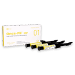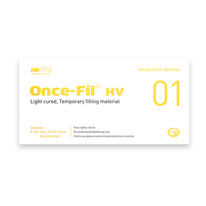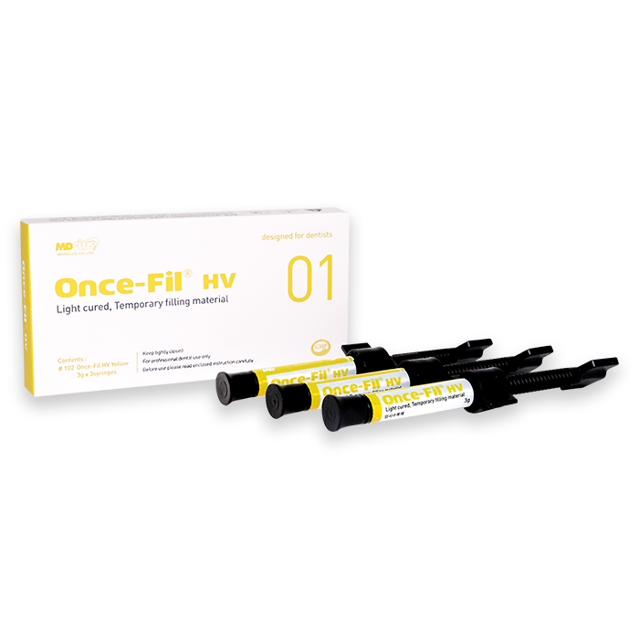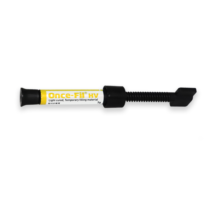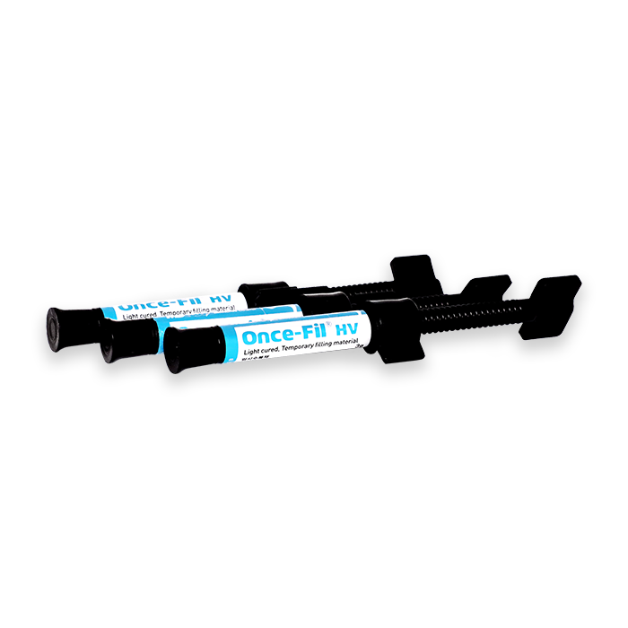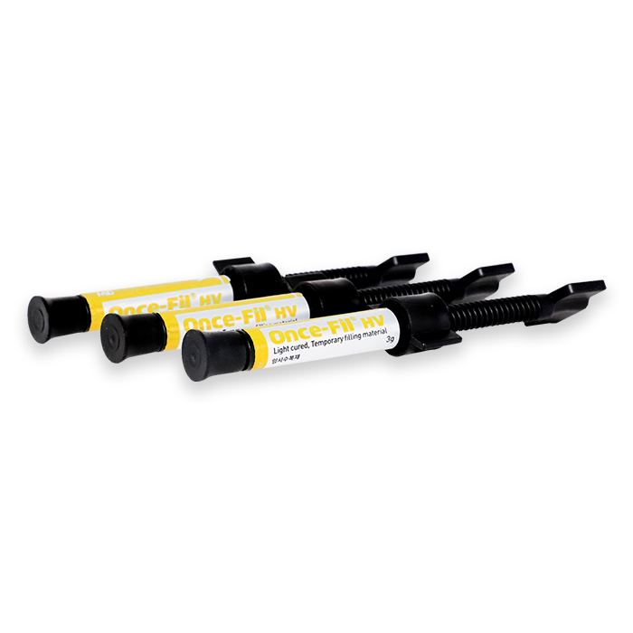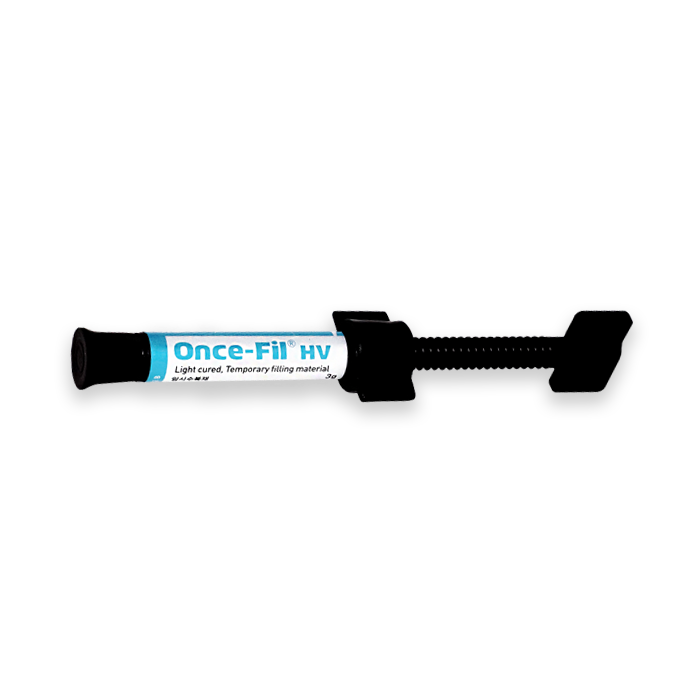 Once-Fil HV is a light curing temporary filling material. Due to its elastic and high viscous characteristics, it can be used simply, easily and suitably for temporary filling such as in-lays and on-lays.