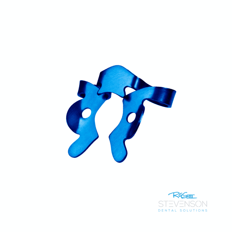 Distal access molar rubber dam clamp for dental rubber dam isolation to access caries and perform endodontic therapy. Blue titanium plasma coated RGS M17D.